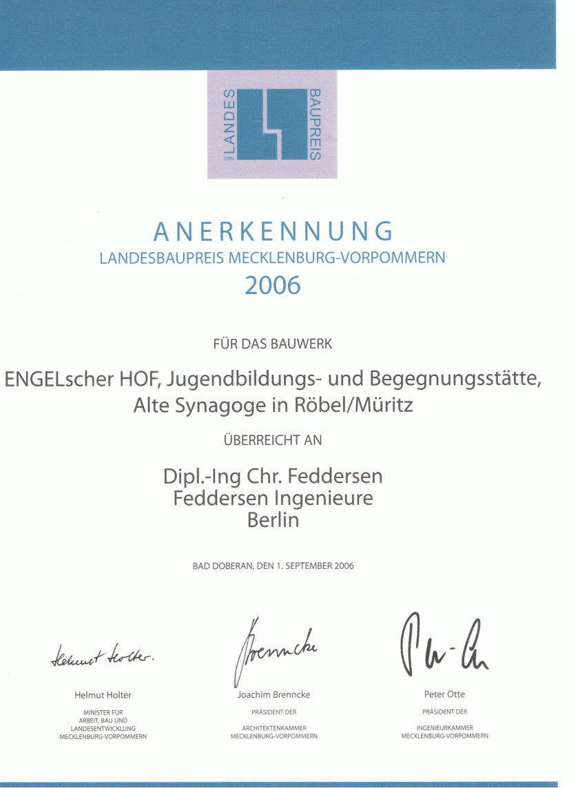 Landesbaupreis MV 2006 Für die Sanierung mit Anbau eines Restaurants der Alten Synagoge (ENGELscher Hof, Jugendbildungs- und Begegnungsstätte) in Röbel an der Müritz.