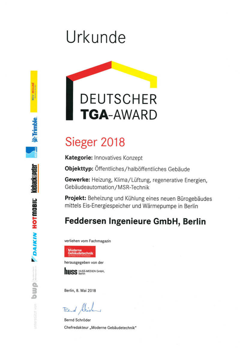 TGA-Award 2018 Für das Inovative Konzept: Beheizung und Kühlung eines neuen Bürogebäudes mittels Eis-Energiespeicher und Wärmepumpe in der Waldstraße 80 in Berlin Reinickendorf.