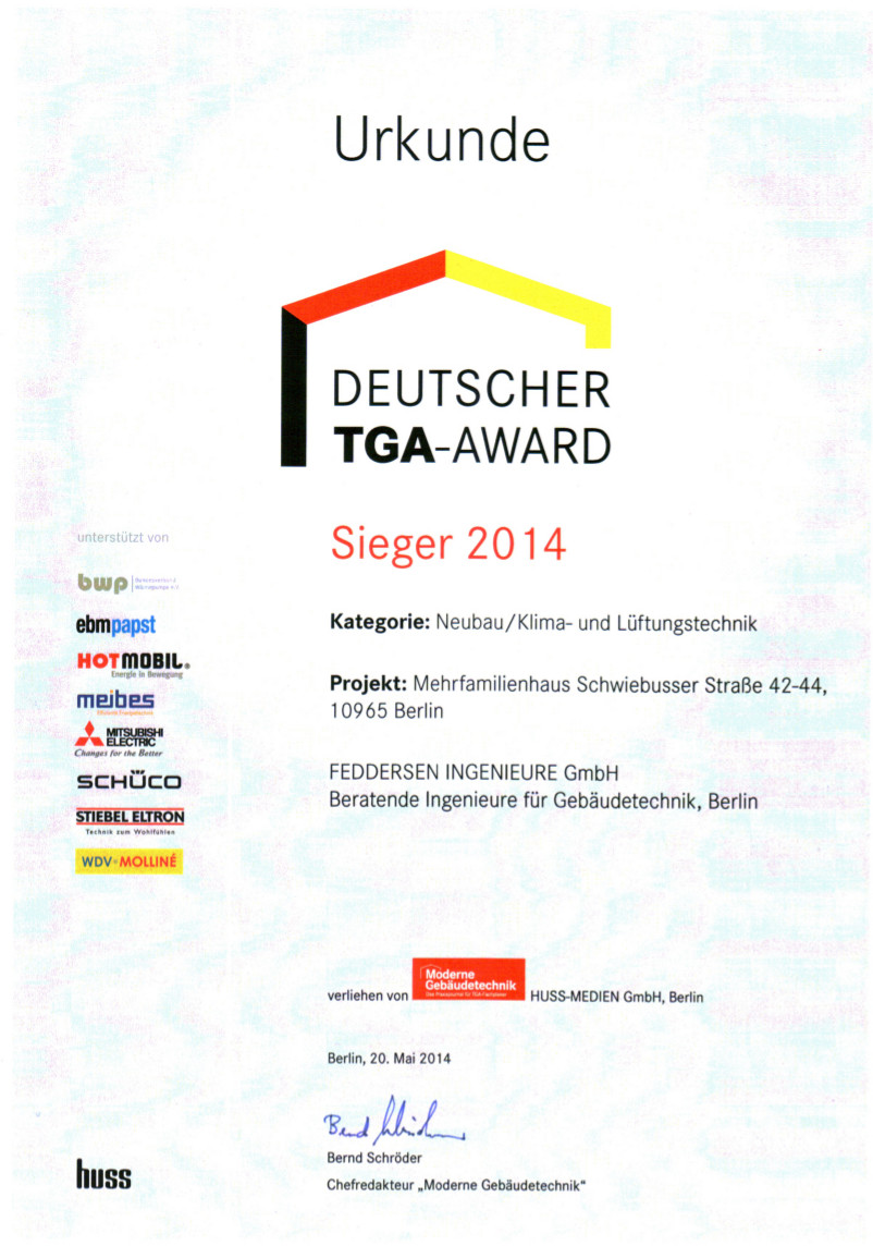 TGA-Award 2014 Für den Neubau eines Wohngebäudes einer Eigentümergemeinschaft in der Schwiebusser Straße 42 – 44 (THF) am Tempelhofer Flugfeld in Berlin.
